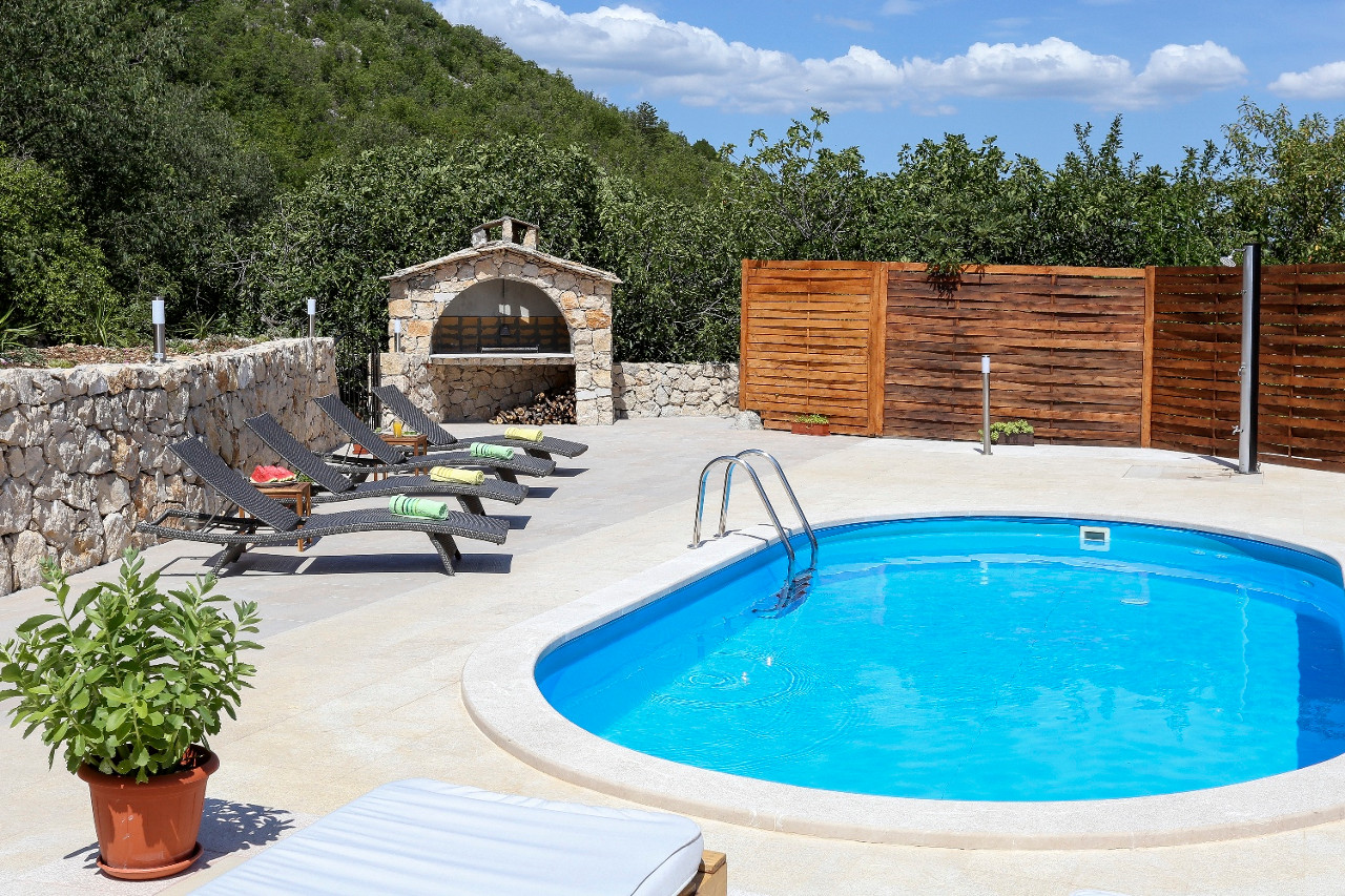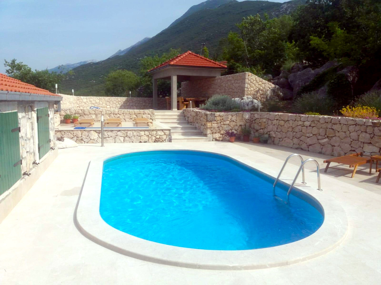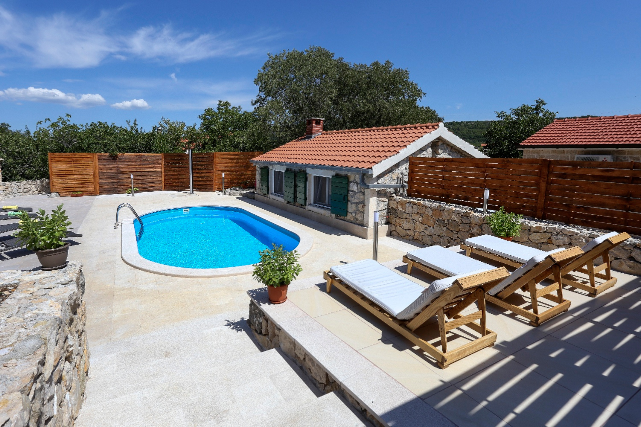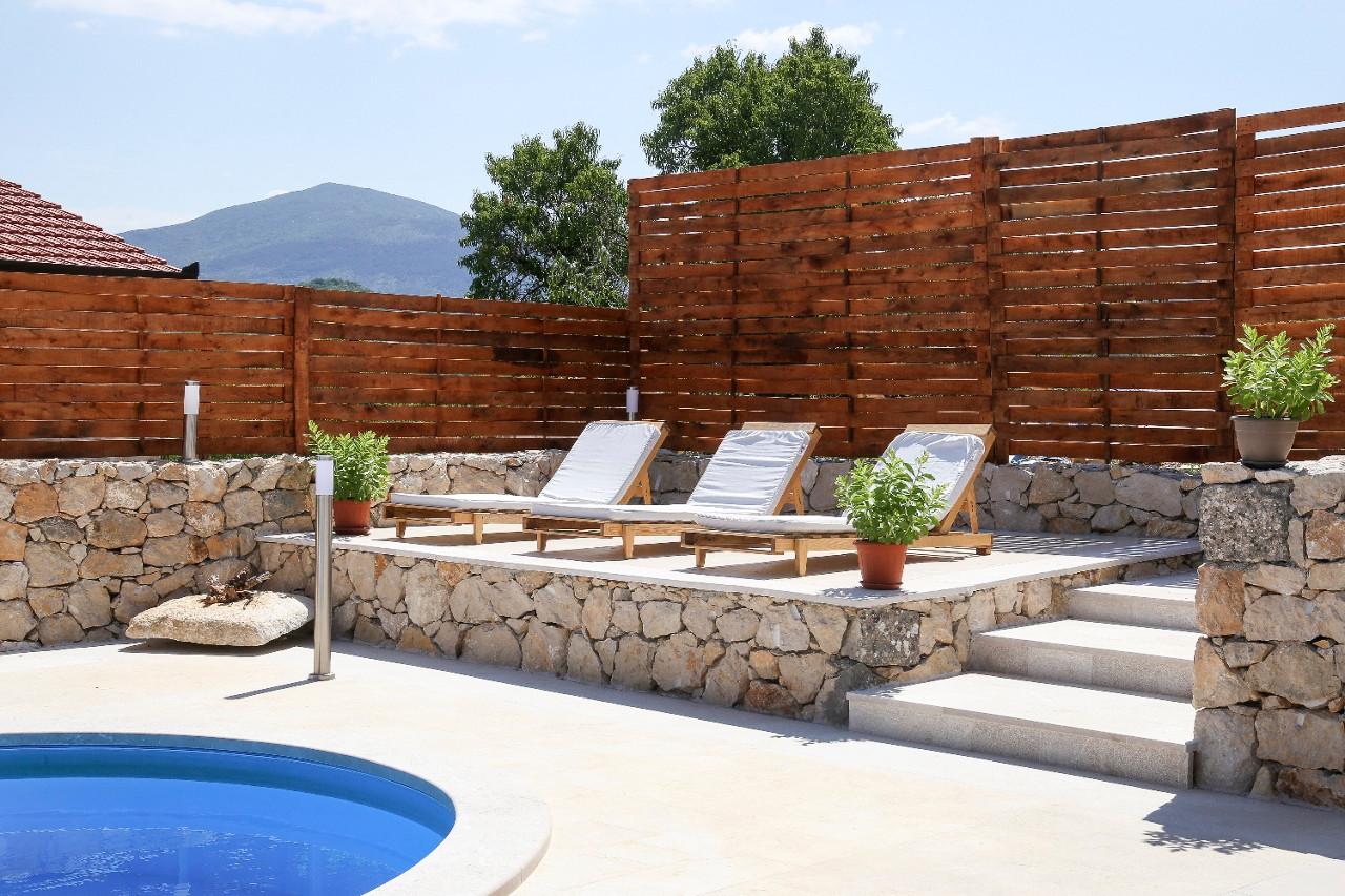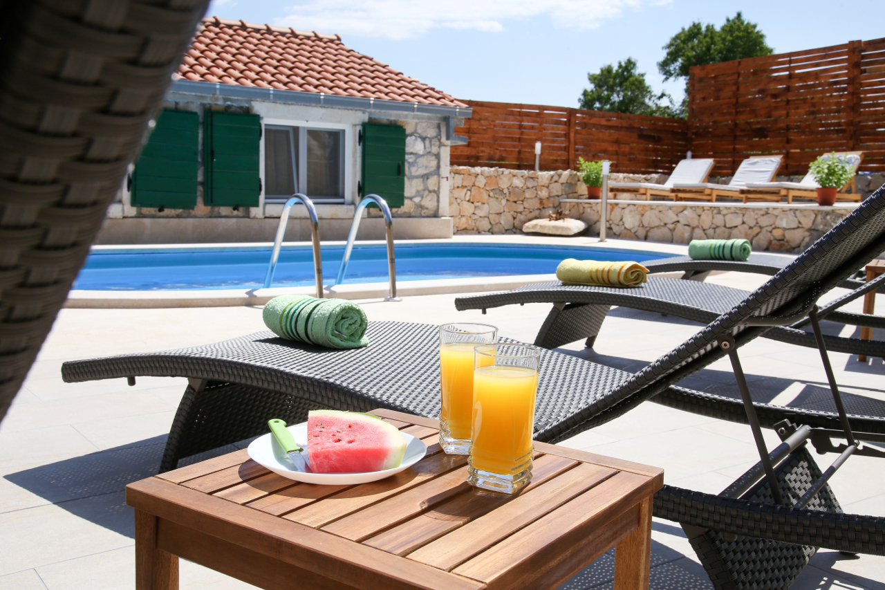 Terrace with outdoor seating is in front of the house. Behind the house is a private yard with swimming pool and sun loungers.